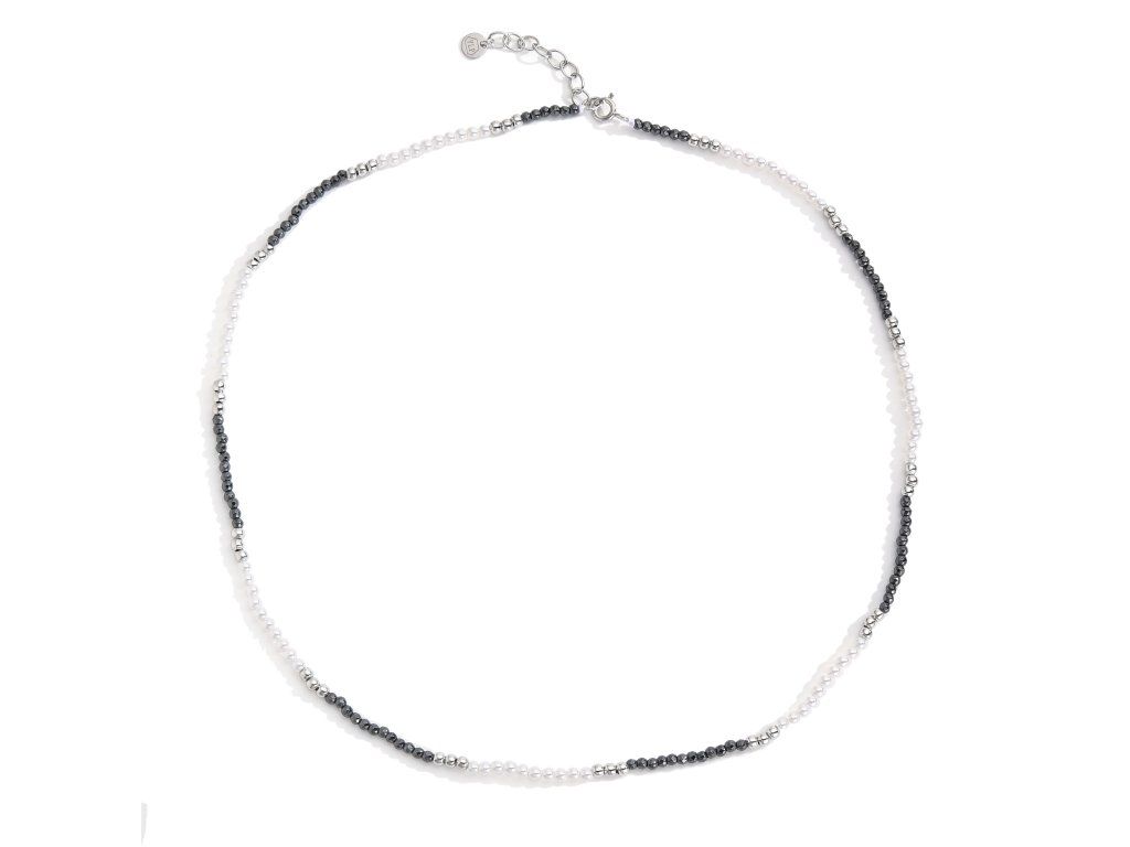 Tento náhrdelník je vyroben z přírodního hematitu s charakteristickým tmavým kovovým leskem a je doplněn sladkovodními perlami, které šperku dodávají jemný lesk a sofistikovaný nádech. Stříbrné komponenty podtrhují elegantní design a zajišťují pohodlné nošení.