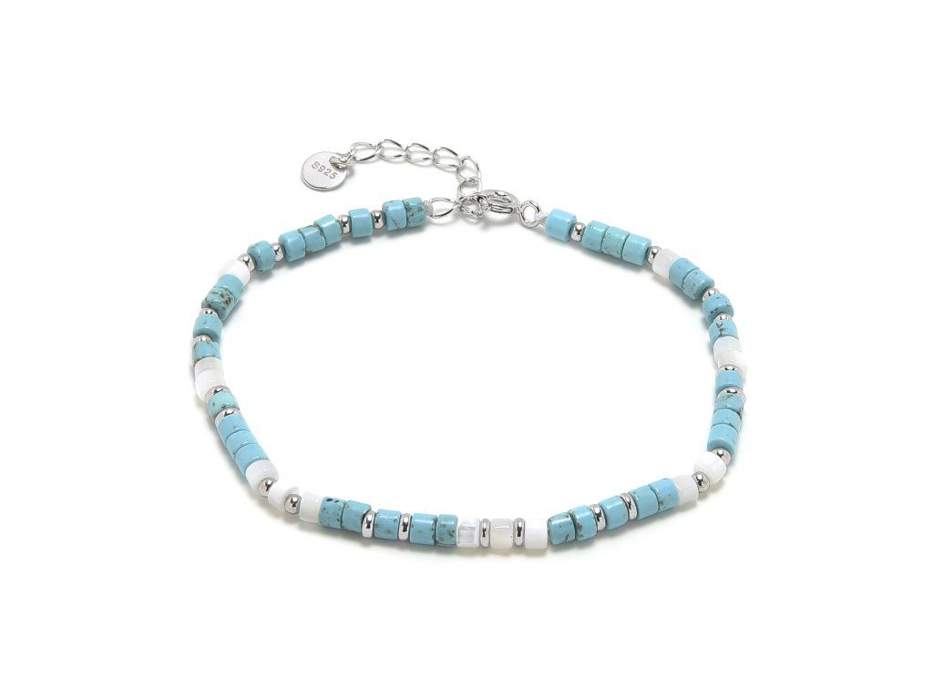 Tento náramek je vyroben z přírodního modrého howlitu s jemnými modrými odstíny a charakteristickými žilkami, doplněného o perleťové prvky, které šperku přidávají světelný odlesk a nadčasovou eleganci. Stříbrné komponenty podtrhují čistý a sofistikovaný design náramku.